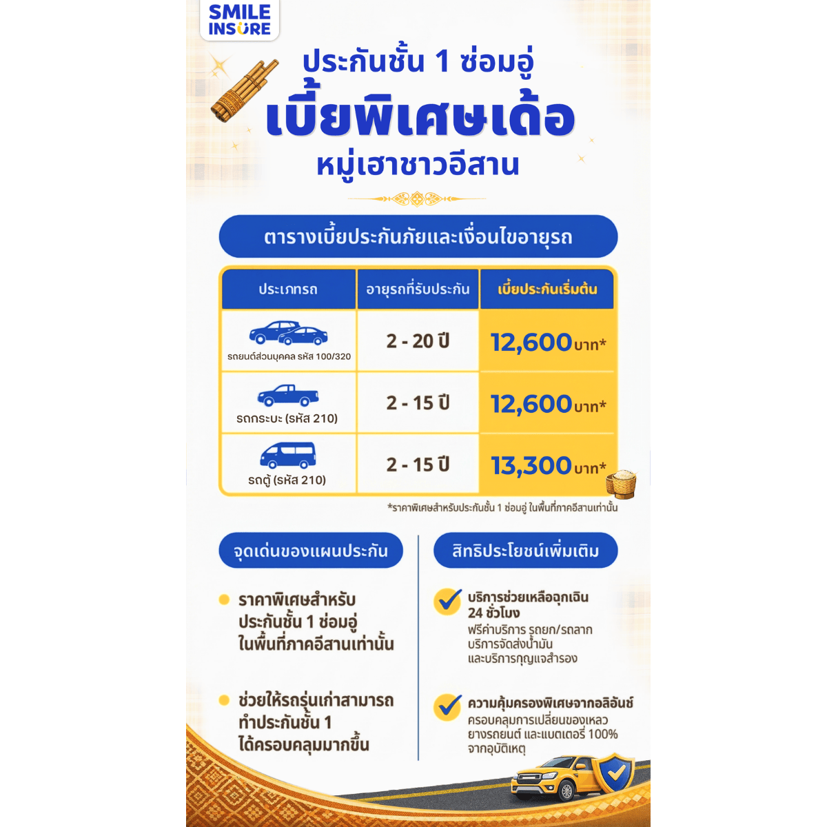 หากท่านกำลังมองหาแผนประกันรถยนต์ชั้น 1 ที่ให้ความคุ้มครองครบถ้วน ในอัตราเบี้ยที่เหมาะสมและออกแบบมาเพื่อผู้ใช้รถในภาคตะวันออกเฉียงเหนือโดยเฉพาะ แคมเปญนี้ถือเป็นอีกหนึ่งทางเลือกที่ตอบโจทย์ทั้งด้านความคุ้มค่าและความอุ่นใจในการใช้งานรถยนต์ในชีวิตประจำวัน สอบถามเพิ่มเติม โทร. 02-233-9999 (9:00-18:00 น.) หรือแอดไลน์ @smileinsure